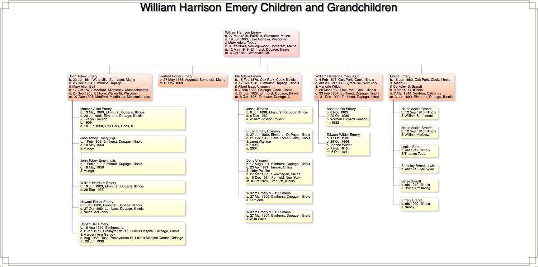 William Harrison Emery was born on 27 Mar 1840 in Fairfield, Maine, and died in Lake Geneva, Wisconsin, on 19 Jun 1903; he was 63. On 6 Oct 1863 (age 23), he married Mary Adelia Tobey in Waterville, Maine. Born on 6 Jan 1843 in Norridgewock, Maine, Mary Adelia died in Elmhurst, Illinois, on 12 May 1918; she was 75. They had five children: John Tobey, Herbert Porter, Ida Adelia (Ullmann), William Harrison, and Grace (Brandt).